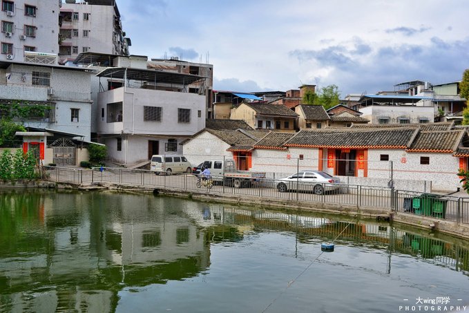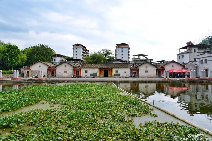 不难发现,多数围屋前都有半园形的水塘,据说,这是传统民居中的典型 “风水塘”,有养人蓄财的寓意,塘越大,财越多,也会出更多的人才。还有另一种说法是,客家人建房是需要挖土,因此才会出现一个大坑,日子久了便形成池塘。其实,池塘对于古民居来说意义非常大,生活中除了用于养鱼、灌溉、洗涤之外,还起到安全防火的作用。门坪前,池塘边,竖立着7座楣杆,标示堂中曾出过七位举人,这是家族引以为傲的荣誉。