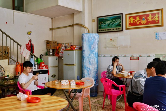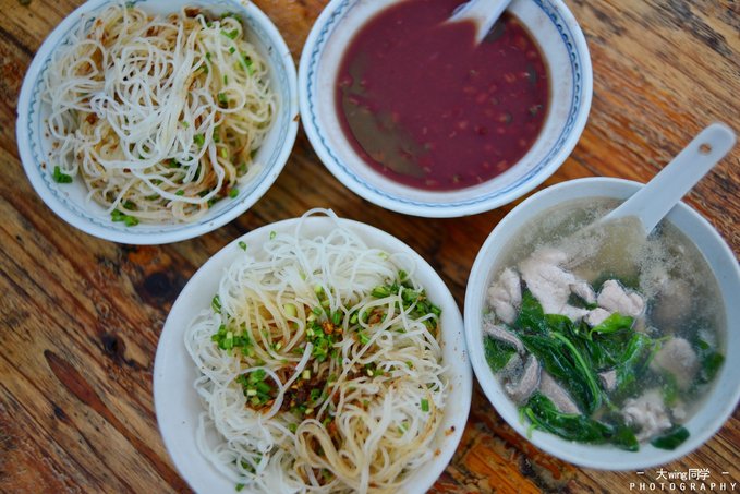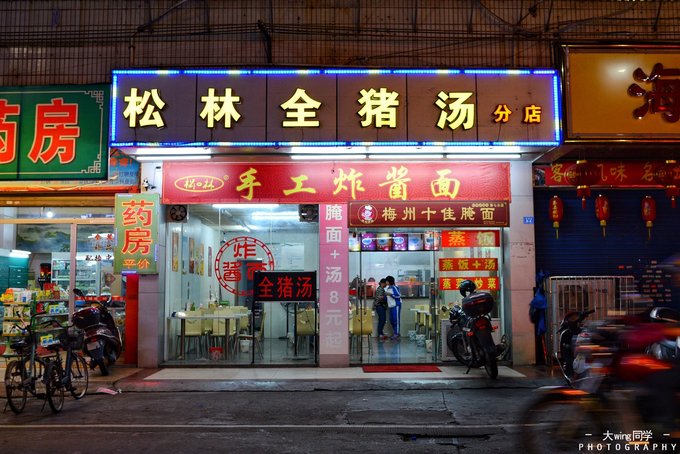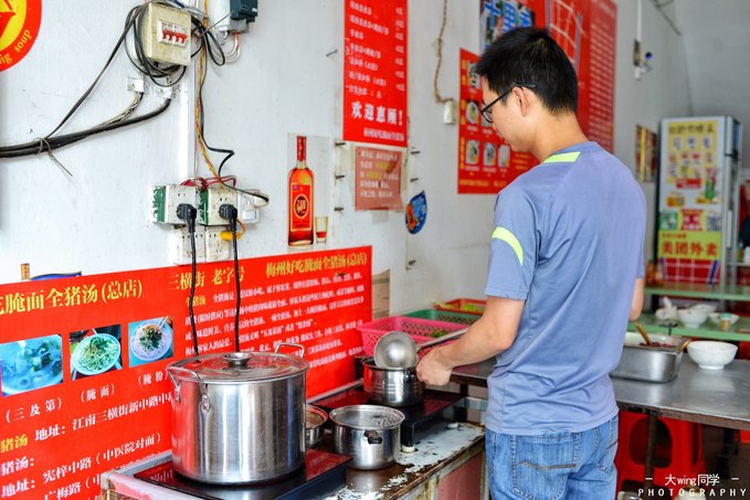 当车辆开进梅城,在街头上一系列的店招里,最亮眼的莫过于“腌粉、腌面”那几个字,这种在梅州遍地开花的美食,是当地人的早餐标配,食材比较单调,只有面条或米粉,上面加点佐料即可,如此简单的面食是如何深入人心的?众所周知,梅州的生活节奏慢,每天早上,许多店铺依然大门紧闭,唯一能看见忙碌身影的,只有这些腌粉面店,他们没有华丽的店面,几把椅子,几张餐台还有那冒着热气的铁锅,成了这里最亲切的风景线。制作一碗腌粉面的时间只需几分钟,价格便宜又好吃,也不会耽误时间,它的存在,不仅仅是一款美食,而是生活中的一部分。一些在外打工的客家人,每每提及腌粉面,都情不自禁地勾起思乡之情。 毕业后,我回到了广州,总觉得缺少腌粉面的生活是不完整的,于是,我四处寻找腌粉面店的踪影,广州、深圳也不缺乏这类店铺,但做出来的味道不一样,腌粉面的做法看似简单,但细节上稍有误差,口感就不同的,估计同学们和我的想法也一样,吃腌粉面,还是得回梅州。腌粉面在梅州很普遍,随便一家都很好吃,如果要我推荐,那就选达兴全猪汤吧。顾名思义,这家店铺主营全猪汤,是当地的老字号,汤料足,腌粉面也做得很美味,来这里可以一次品尝两款美食。