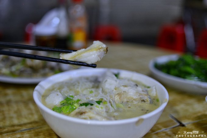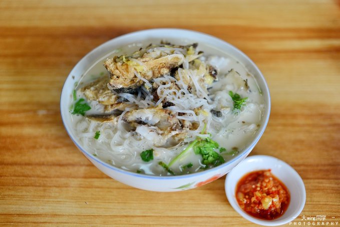 鱼头煮粉,大街小巷里的又一主角,醒目的招牌随处可见,与腌粉面一样普遍,奶白色的汤就是米粉最美的嫁衣,只要尝一口,舌头马上怀孕,味蕾完全被其滋味俘虏。