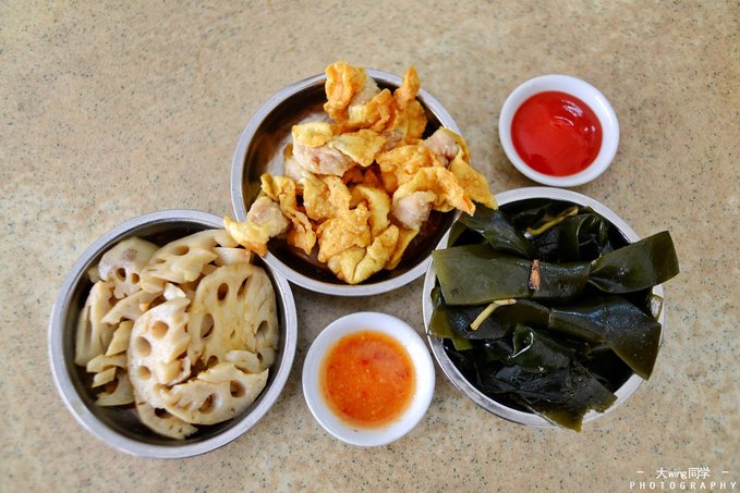 特别推荐这里的腌莲藕和腌海带,是这里的必点小吃,酸辣味恰到好处;炸小饺皮薄馅满,炸出来非常爽脆,不会油腻,3元7只的分量有点多;炸味酵粄,其实“粄”是客家语中的特色词汇,就像糍粑一类的米制饼,如果你是第一次尝试味酵粄,推荐先吃原汁原味的,再吃油炸的。