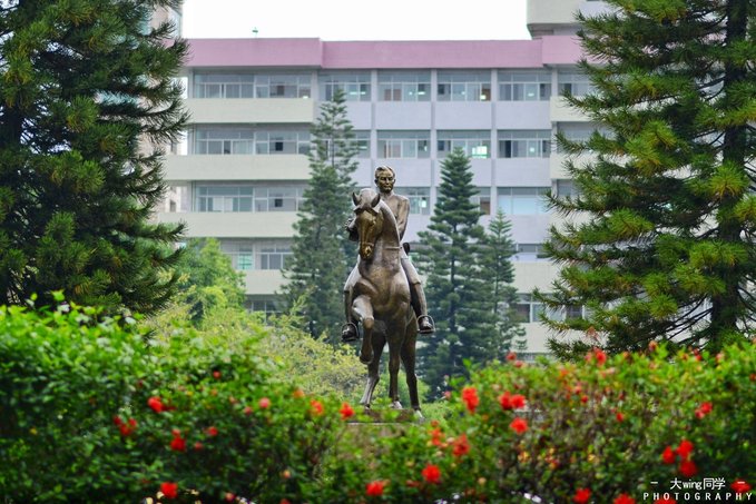 从南门进,两旁绿树成荫,这些老树伴随着一代又一代的人度过他的大学时光,荷花池畔屹立着一尊叶剑英铜像,叶帅为梅县人,是我国伟大的革命家,因此,铜像成为毕业照的热门打卡之地。