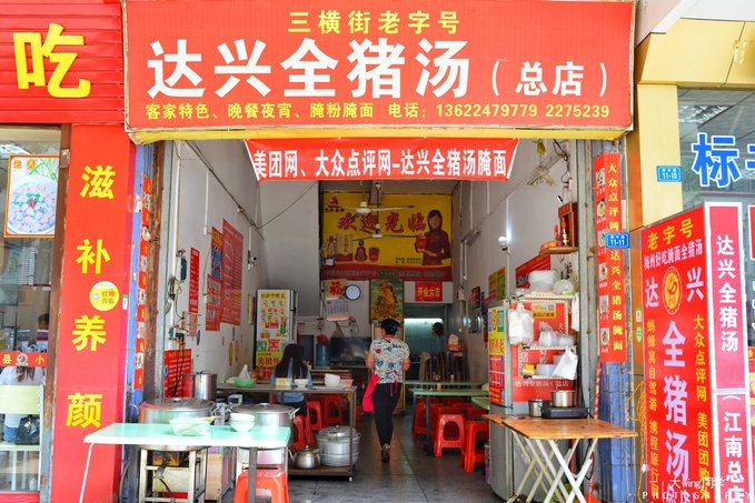 达兴全猪汤的总店位于江南新中路中段,在江南、新县城、黄塘、月梅等地也开有分店,作为梅州的网红餐馆,达兴依然保留了最亲民的装修风格,红色门面耀眼而不浮夸,路过时一眼就能看到它,自驾的可以停在路边的白线内。