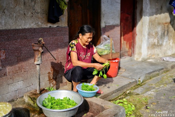 大门有一口古井,上面刻着“饮水思源”四个字,寓意客家人不忘初心,牢记根本。