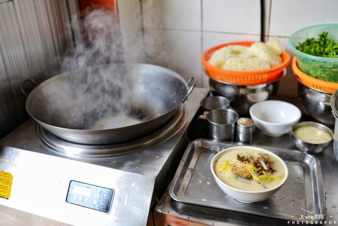 如此美味的汤粉,关键在于材料,要选取现杀的鱼头,在锅里煎至金黄,加入清水慢炖,直到汤变奶白,最后加入泡好的米粉一起煮,看似简单的工序,其实整个过程要二十分钟。老板客源多,一天下来基本没停过。