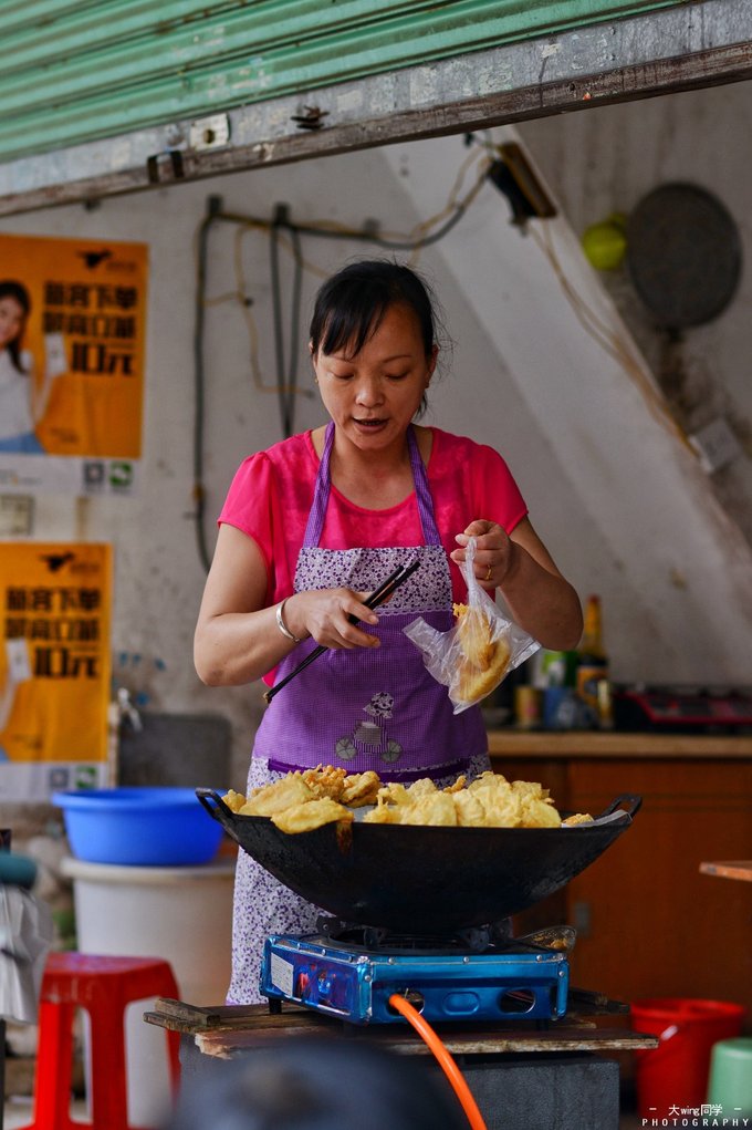 张叔,住在老街的黎屋巷,他做的咸煎饼特别好吃,外脆内软,咸度刚刚好,1元1块非常实惠,上午他会在家门口一边炸一边卖,下午才会摆到十字路口售卖。