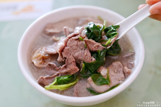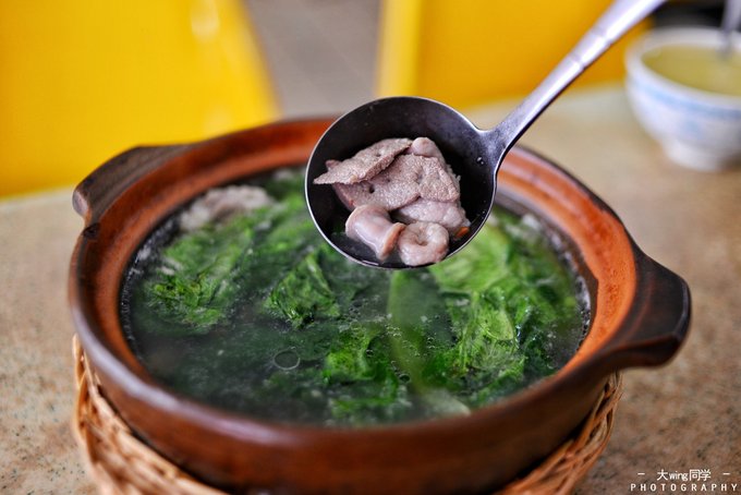 除了小吃,这里还有几十款甜品、小炒、煲类和碟头饭,绿豆沙跟我们广州的不一样,甜度低,还带点稀粥的感觉。在这里,不得不提我最爱的三及第汤,它属于客家传统小吃,历史悠久,不仅被列入非物质文化遗产名录,也被评为十大长寿菜肴之首。取名“三及第”是有一个典故的,在古代,及第即科举上榜,清朝状元林召棠常用肉圆、牛肝、猪粉肠做成汤,某天,一御史前来探访,看到林状元的汤便问其名,林状元心知御史望其子能在科场高中,便随口说了句“及第汤”,御史回家后便做了一碗一模一样的汤给儿子喝,没想到还真的让他高中状元,三及第汤也因此而出名。其实,除了三及第汤,还有四、五、六的及第汤,只是食材有点不同而已,我们平时所吃的三及第汤,是用猪肝、瘦肉、粉肠所熬制的,搭配枸杞叶更加鲜味。