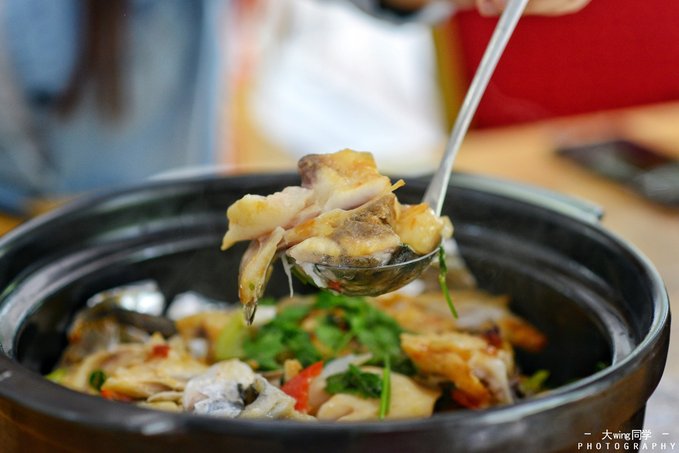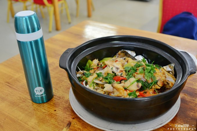 砂锅鱼头是这里的必点菜式,本侧鱼头就有一大锅,与我的特百惠保温瓶对比一下就知道有多大了,感觉是3人的分量。俗话说 “一个鱼头半枝参”,可见鱼头的营养价值之大,越大的鱼头越美味,里面的胶原蛋白越多,其肉质细嫩,滑爽适口,重点是没有细骨。