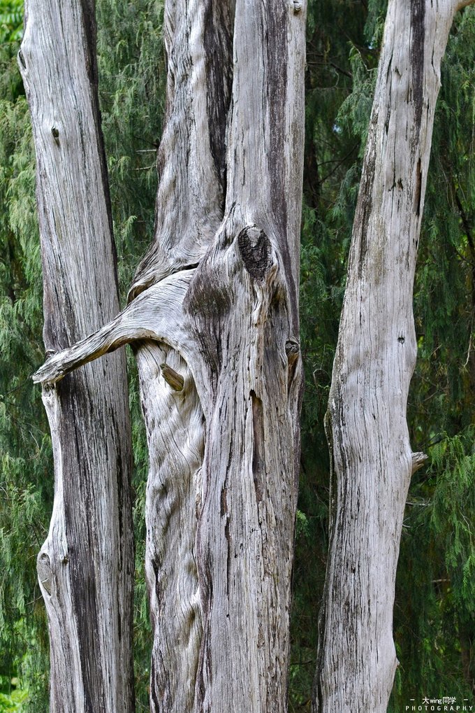 在枯柏的树干上,有一则天然神像,当地称为“祖师爷”,但我越看就越像魔法师,它头戴帽子,手执魔杖,静静地在观望人间。