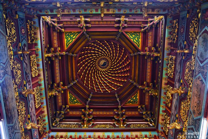 藻井建于明朝,距今已有六百多年的历史,整个结构没有用到一颗钉子,只用1000多块长方木料搭建而成,可谓鬼斧神工。正由于它的特殊结构,才能及时把大殿内的香烟吸到殿顶然后迅速排出,再生动一点形容的话,就叫它“抽油烟机”吧。目前国内只有两个地方存在这样的菠萝顶,一是灵光寺,二是北京天坛。