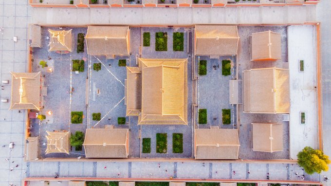 我们来的时候庙里已经过了参观时间,但往里走所来到的十三个大敖包是全天都可以看到的。敖包是 蒙古 人用来祭祀、祈福的,非常神圣。关于敖包也有非常多的讲究,来到这里最应该知道的是为什么它会有13个。因为在内蒙,敖包都是单数出现, 比如 1,3,5,7……这样数下去,而最多出现的个数也正是13个,据说是这样的,一年有12个月,到了第13又是一个新的轮回。因为13个数量较多,相机用广角也无法全部呈现,无人机走起, 伴着落日的余晖,整个画面还是很美很和谐的。