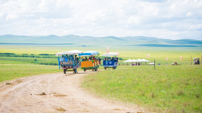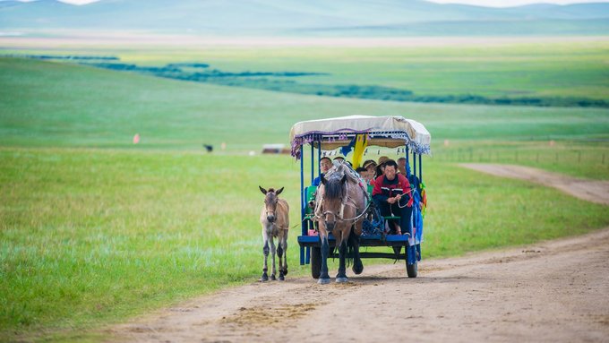 因为山高路远,到九曲弯的观景台需要乘坐马车前往,马车共有三排,我们这一车,三位小姑娘抢了第一排坐下,这可能成为了他们整个锡盟旅行最有味道的体验了。因为那匹马一路上放了很多屁,时不时的还拿尾巴扫一下。奇怪的是我们回程的马匹却很老实,任劳任怨一个屁都没放。