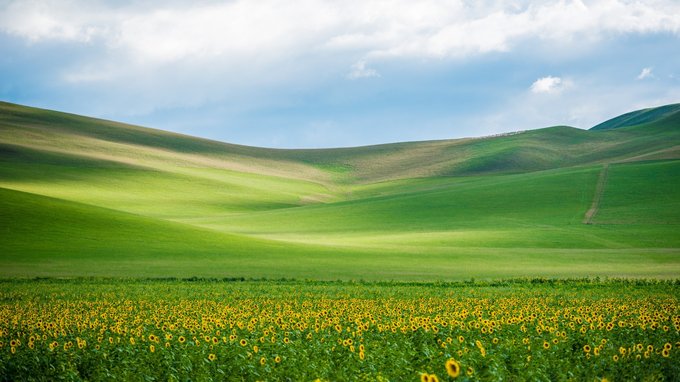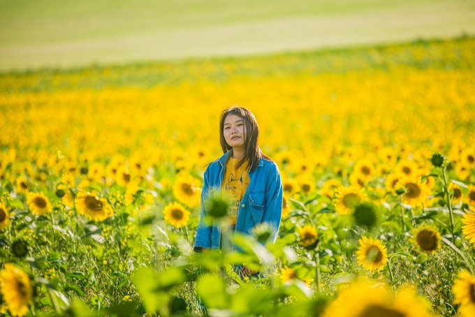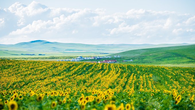 路上还发现了一大片的向日葵,停车!这样的地方拍照是毋庸置疑的。这向日葵与草原的撞色美我还真是第一回见。来锡盟草原千万别错过了这片彩虹弯。