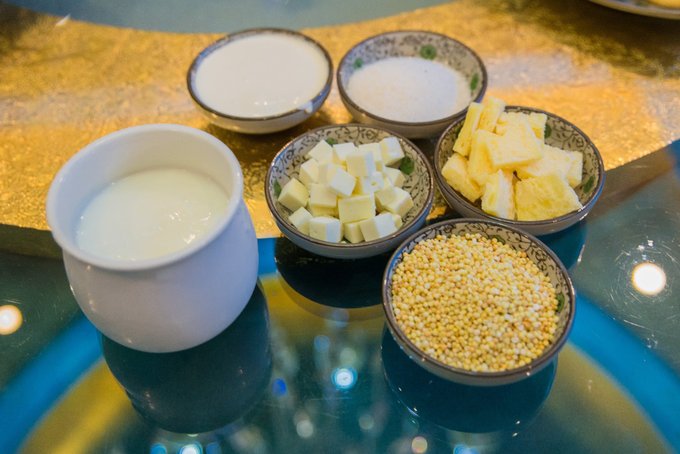进入餐厅,惊叹于内蒙人民的豪放和时间充裕。在我们江淮大地,早上吃根油条喝碗豆浆就要匆匆忙忙去上班了。而在格日勒阿妈,你一定会放慢自己的节奏,单单是羊肉和奶制品就有无限的吃法,反正我是没有这么讲究的吃过早餐,那就看着顺眼的点吧。总结一下, 内蒙草原长大的羊很少有膻味,大部分人都能吃的惯,蘸上喜欢的蘸料一般没有人会拒绝;而奶制品也更加纯正,把奶酪或者奶条加在酸奶里再拌点白糖简直完美,你也可以细细品味,也可以像我一样狼吞虎咽连干三碗!