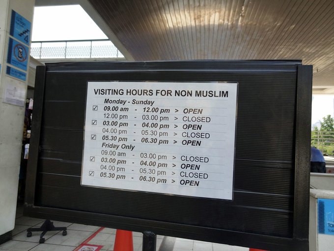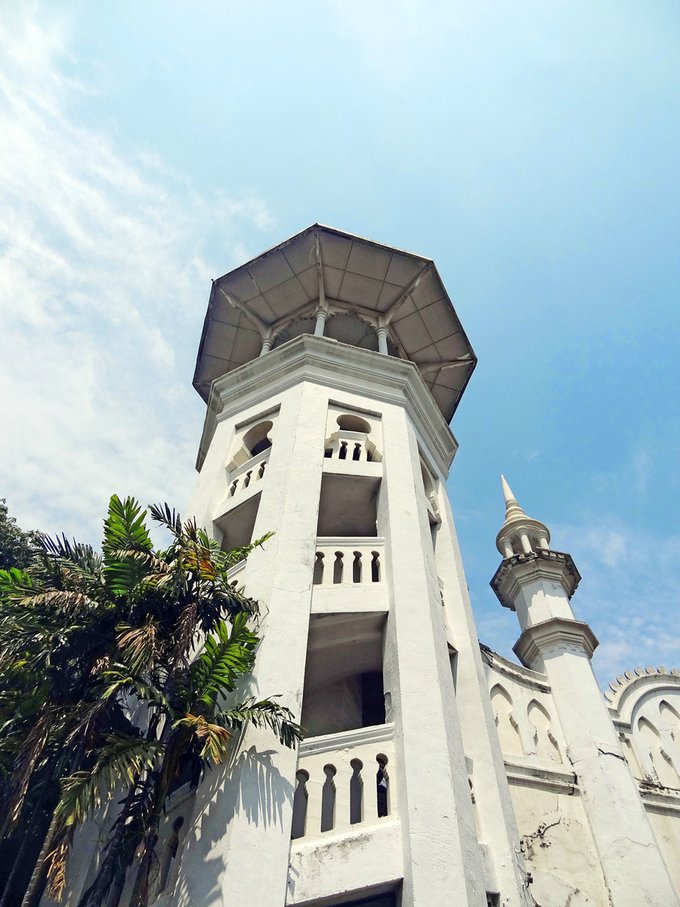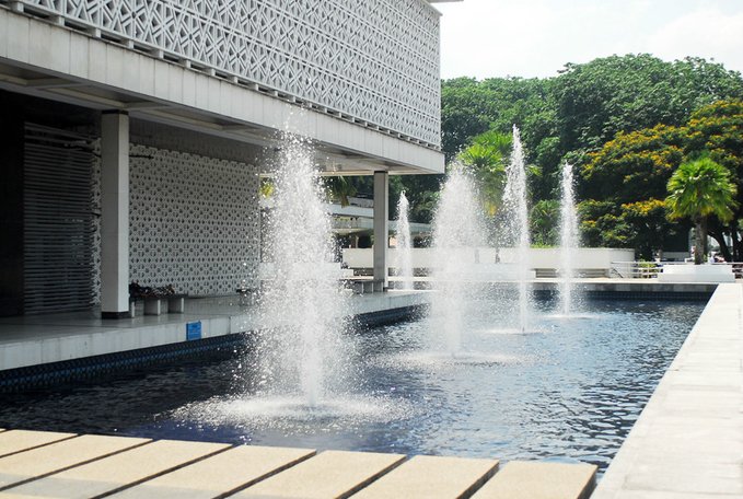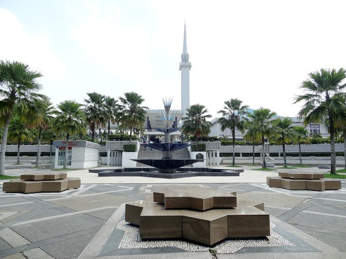 国家清真寺(National Mosque),建于1974年,建筑风格融入了伊斯兰的传统美感,是吉隆坡回教徒常去祈祷的地方,可容纳8000人,游客进内参观必须赤脚,着装需整洁,女士还需佩戴头巾,头发不能外露。可免费参观,但有时间限制,参观时要登记国籍和姓名,并穿上紫色大袍,在门口就有免费租借,可以在旁边领一瓶免费水。整个建筑可分为祈祷大厅、大尖塔、陵墓和办公大楼几个部分,其中祈祷大厅是核心部分,也是整个建筑的精华,屋顶由49个大小圆拱组成,呈18条放射星芒,代表马来西亚13个州和伊斯兰五大支柱,但只允许穆斯林进入,游客只能在外面看,可以拍照,其他地方也可以逛一下。