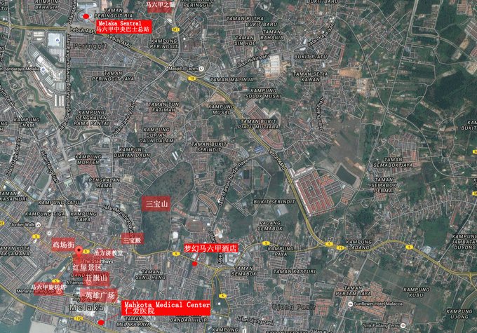 自制的地图,淡红色是景点,上下两个红点分别是Melaka Sentra(马六甲中央巴士总站)和Mahkota Medical Center(仁爱医院),中间的红点就是今晚住的酒店,可以看出各个地方彼此的距离,大家可以参考一下。靠近红屋区的酒店一般价格较高(300以上),大家可以选择马六甲运河那一带的酒店,也有150元以下的。