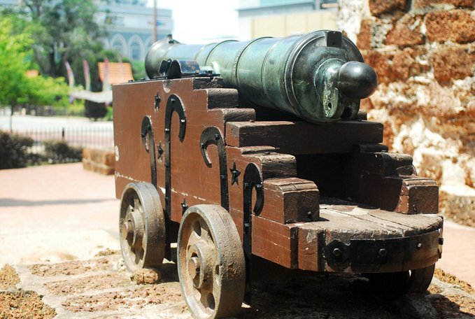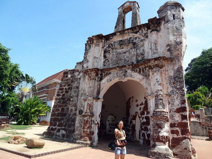 在山顶歇了一会,骚扰了几只喵星人后,又随另一边的小道下山,到达圣地亚哥城堡(Porta de Santiago),途中远远的看见苏丹王宫,因时间关系没有进去。圣地亚哥城堡在升旗山山脚下,这是见证了马六甲历史的古城门。