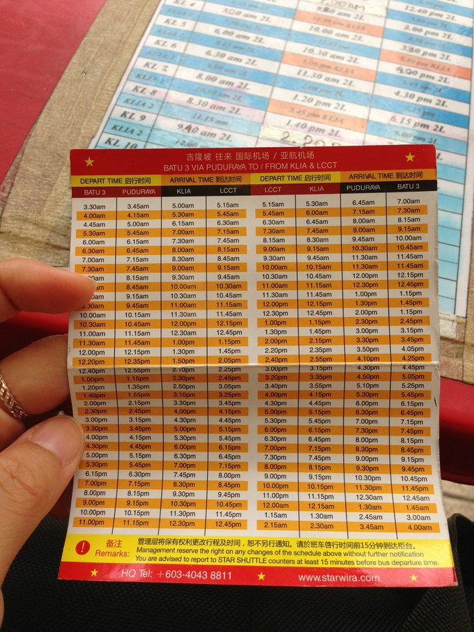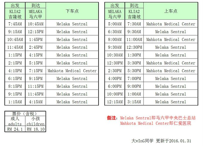 本人自制的表格,注意出发时段,Mahkota Medical Center(仁爱医院)也是其中一个下站点,靠近英雄广场,穿过升旗山就能到达红屋了。车讯偶尔会有小变动,建议买票时问一下售票员。