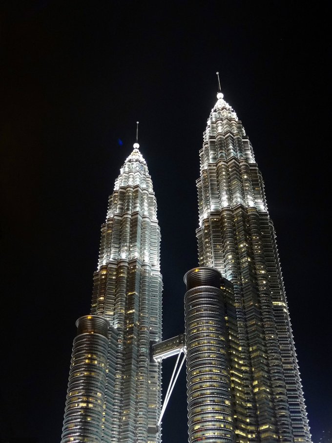隆坡双子塔,即国家石油公司双塔楼(Petronas Twin Towers),是马来西亚国家石油公司用20亿马币建成的,1993年12月动工,1996年2月封顶,1997年建成使用,共88层,高452米,是吉隆坡,甚至是整个马来西亚的地标建筑!曾是世界最高的摩天大楼,保持了22年的最高记录,直到2003年才被台北101超越(目前最高的是哈利法塔即迪拜塔,双子塔排行第7位)。底层是商场,平价和奢侈品牌都有,上层是办公楼,游客可购票乘坐电梯到达41层的Sky Bridge(天桥)和86层的展厅俯瞰吉隆坡的全景,官网:http://www.petronastwintowers.com.my/