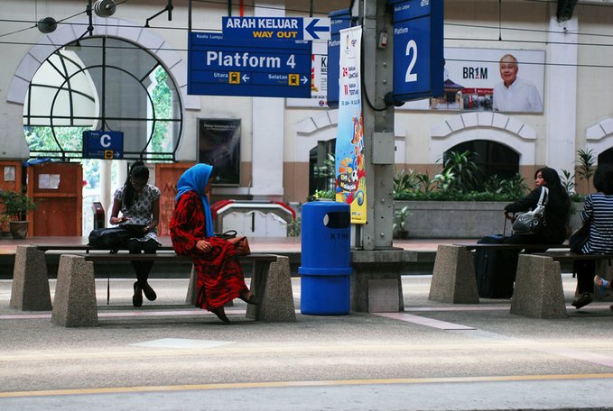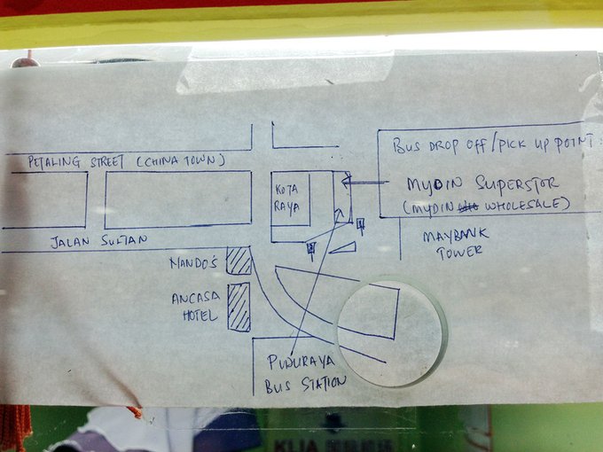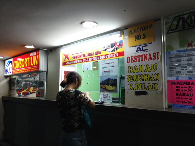 富都车站(Pudu Sentral Terminal),是吉隆坡主要的三个长途汽车站之一,内部略旧,售票处比较难找,很多小黑在拉客,因为车站里有很多不同的汽车公司在经营,小黑拉到你他就有提成。楼上有美食区,米饭和面条都有,价格不算贵。ps:从2015年12月15日开始,富都车站已沒有长途汽车发车,全部迁往BTS站运行(网友信息)。从富都车站去KLIA2航站楼单程1.5小时,12马币/人。我们经小黑指引,来到其中一个售票窗口买票,经售票员马式英语指导,要到车站对面的路边候车,那里会有小黑接应。乘车点可以看下面的地图,步行过去很近,候车点会有人举牌,小黑们都很热情,唯一不足的是只能站在路边,没有正式的休息椅子给你坐,在炎热的夏天会令人产生疲惫感。