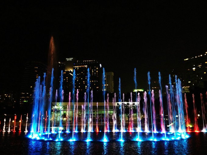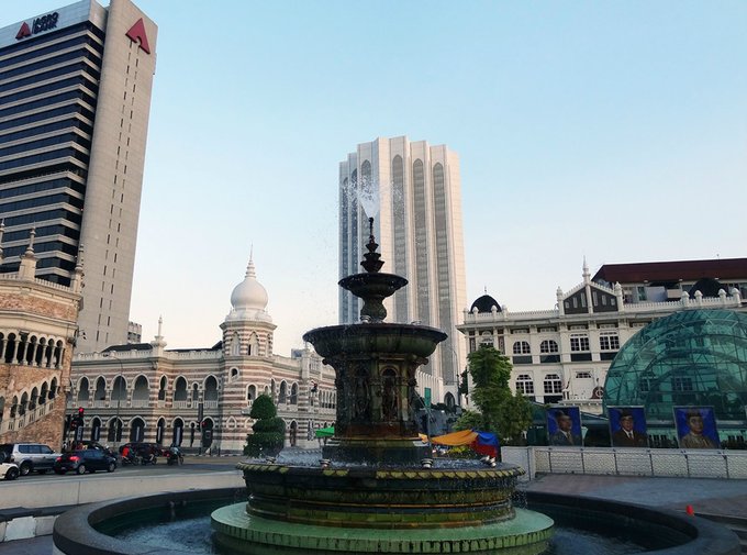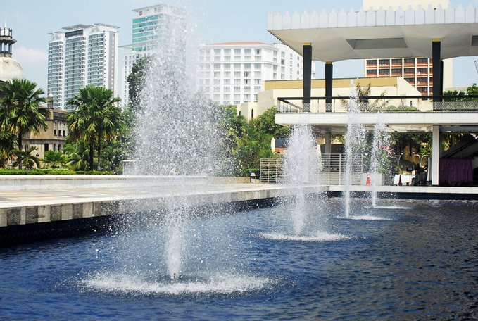 广场上的喷水池,这个角度可以看到苏丹阿都沙末大厦的边角(左方)、吉隆坡国立纺织博物馆(中间)和前国家历史博物馆(右边)。