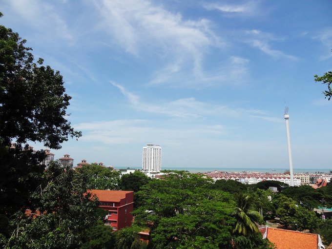 在山顶俯瞰整个马六甲海峡,右边那个就是是马六甲旋转塔