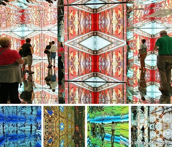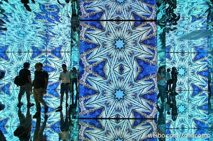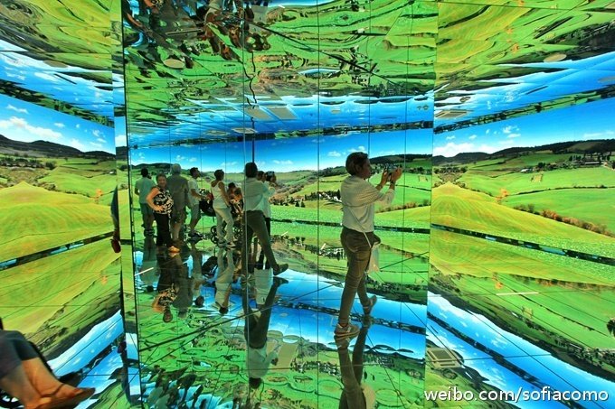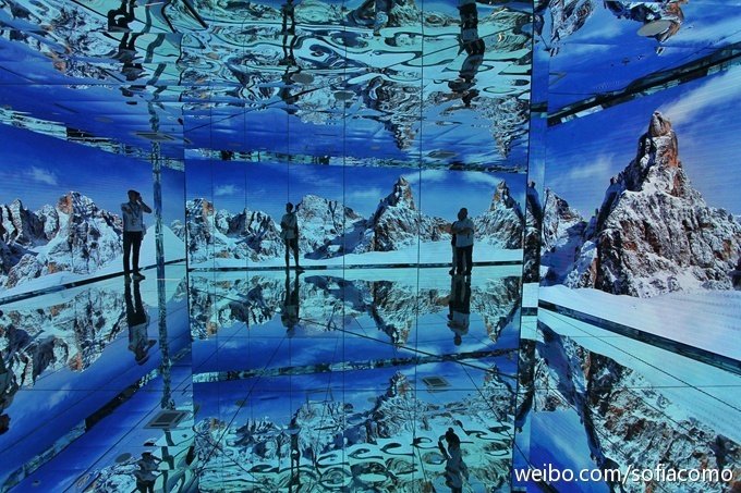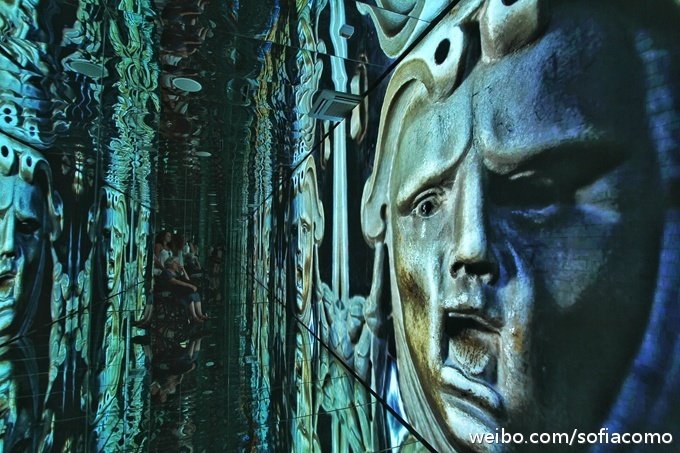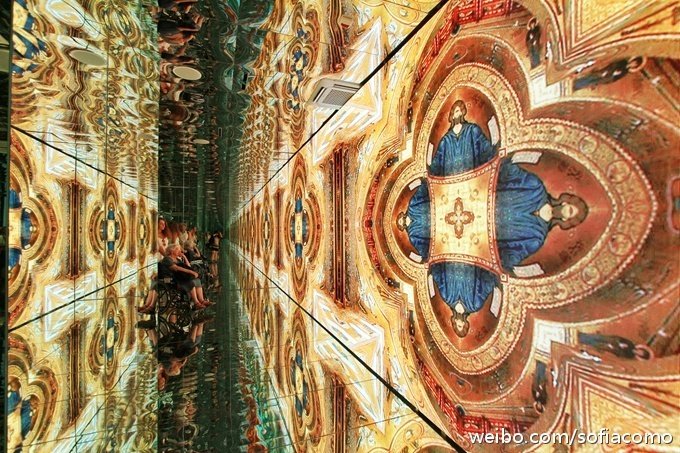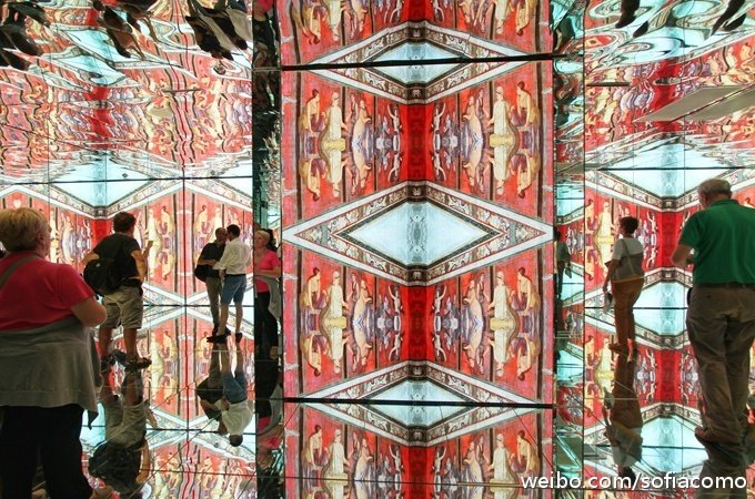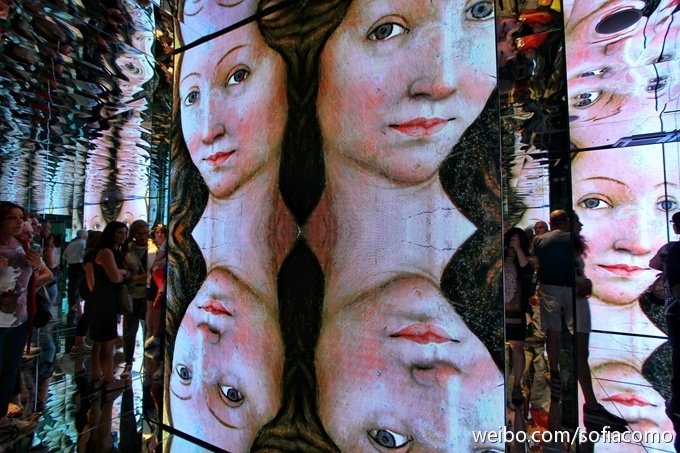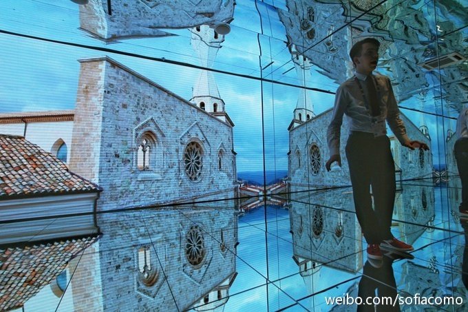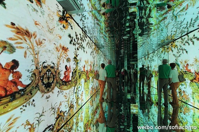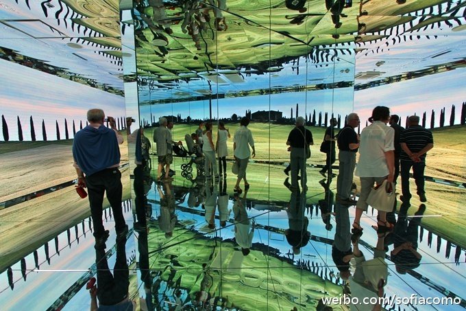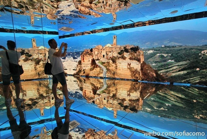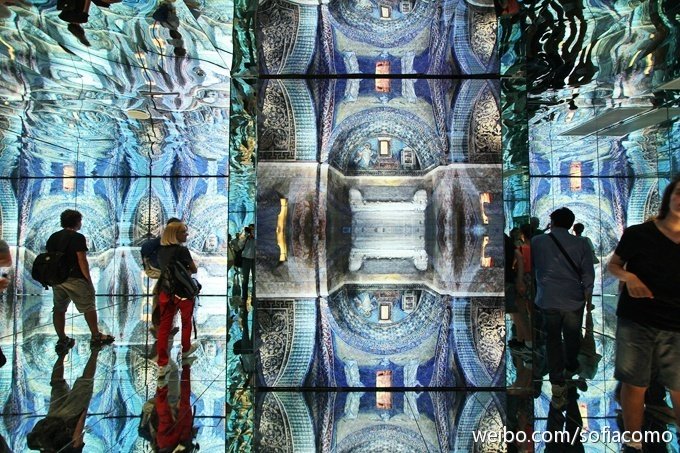 三个连续的厅, 四面全是大屏幕,天上地下全是镜子,大的厅中间的柱子或者小空间也全部包上镜子,而屏幕上不断展现出意大利最美的风景、建筑、艺术,镜子把整个空间反射成一个万花筒,瞬息万变又无比夺目。