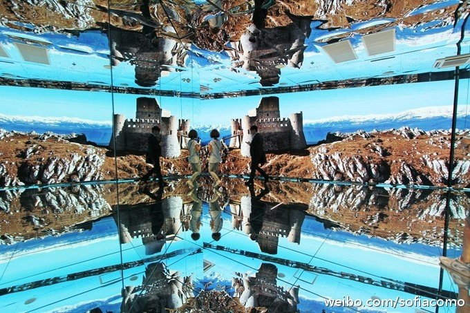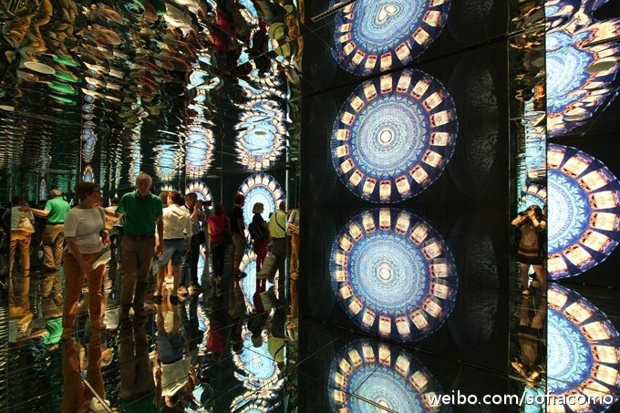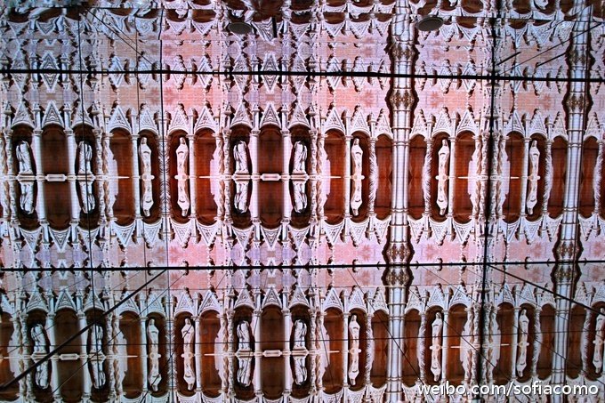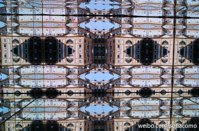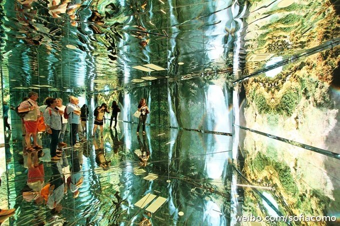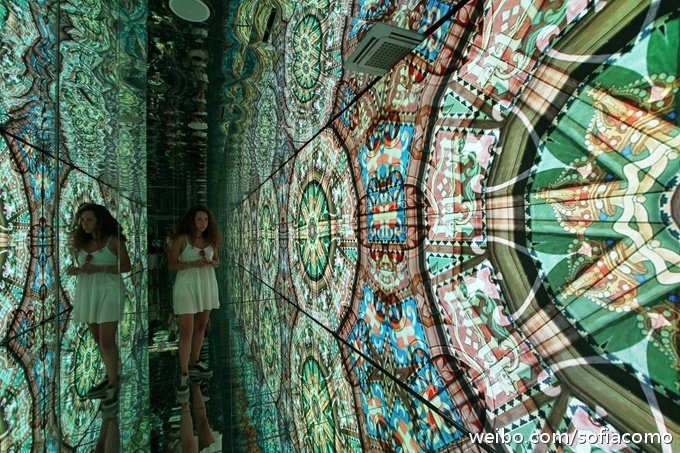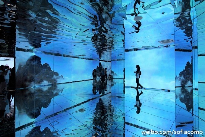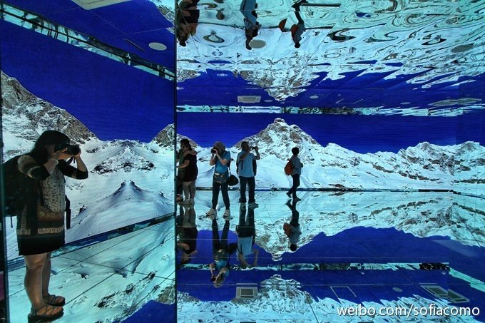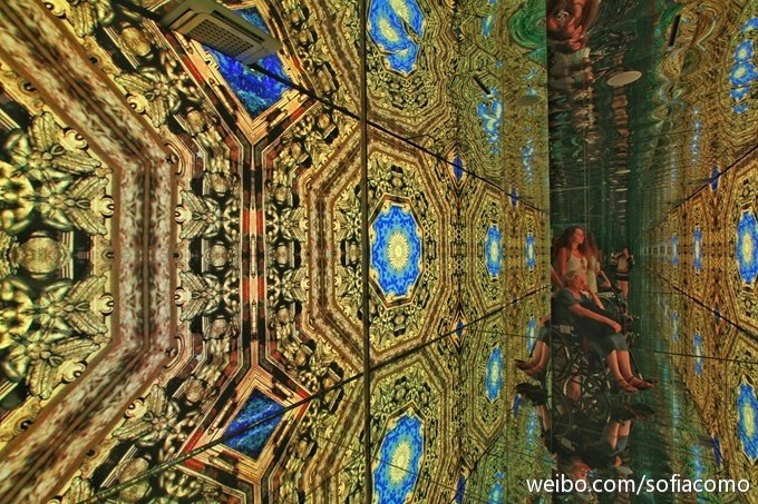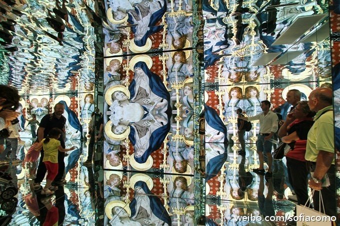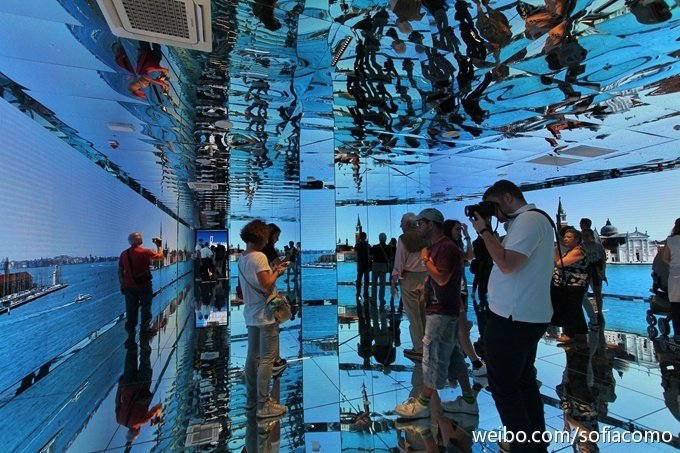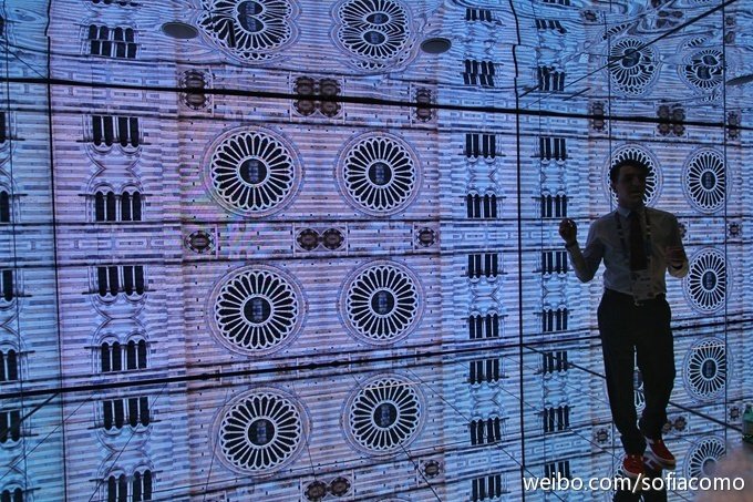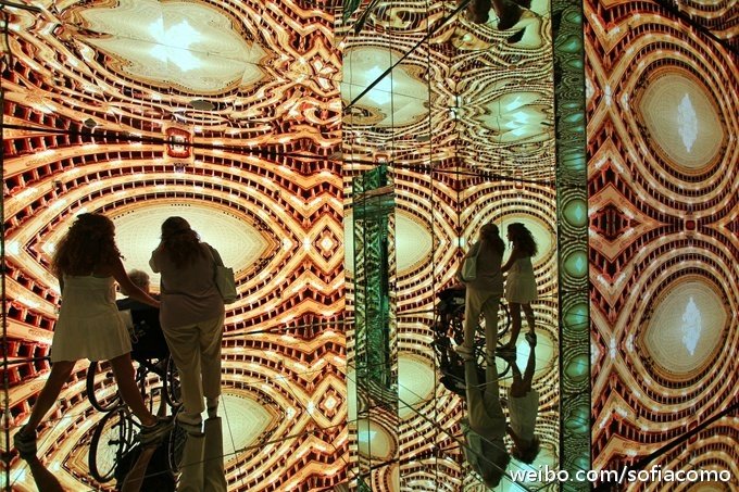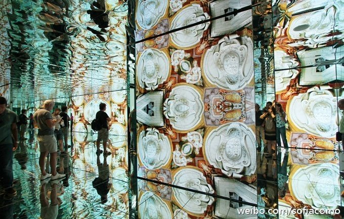 三个连续的厅, 四面全是大屏幕,天上地下全是镜子,大的厅中间的柱子或者小空间也全部包上镜子,而屏幕上不断展现出意大利最美的风景、建筑、艺术,镜子把整个空间反射成一个万花筒,瞬息万变又无比夺目。