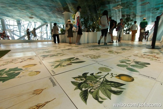 据说,意大利是欧洲植物最多样性的国家。在展厅的三楼, 意大利的二十个大区各自选出一种最能代表他们当地的地理、气候以及生活方式的植物联合展示。这个厅的地板全部由古典风格的植物科学画组成,如果你象我一样是个植物科学画爱好者,一定会喜欢。