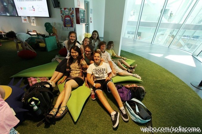再说个小插曲:在意大利馆的休息区抓拍几个意大利小朋友,结果一个小男生跳出来要求与我合照,其它小朋友也纷纷跟风加入,弄得在一旁看上去比我还年轻的家长大笑说:“你们都要上镜,谁来拍啊!” 事后将合影发朋友圈,有朋友总结: “意大利男人果然从小就会泡妞!” 不过, 我可不是妞,我是老阿姨了,这张脸真的经不起顶光拍照了,再被小粉脸们一反衬真是惨不忍睹。