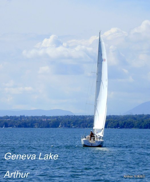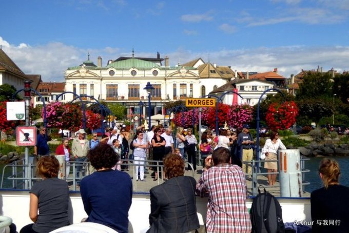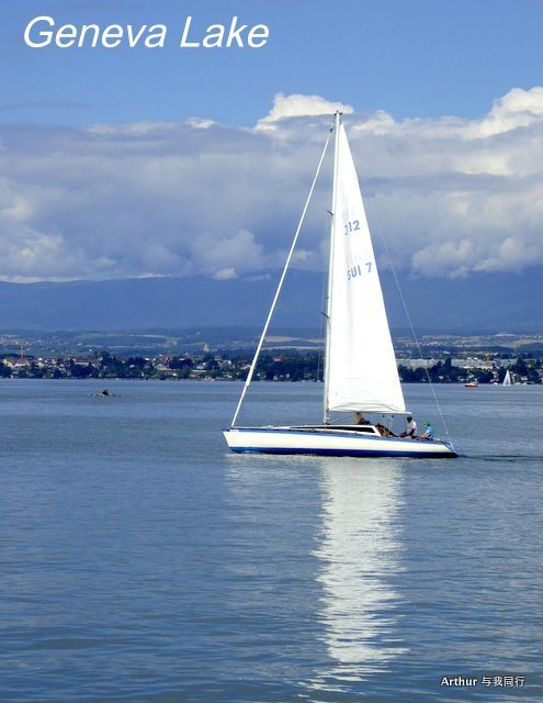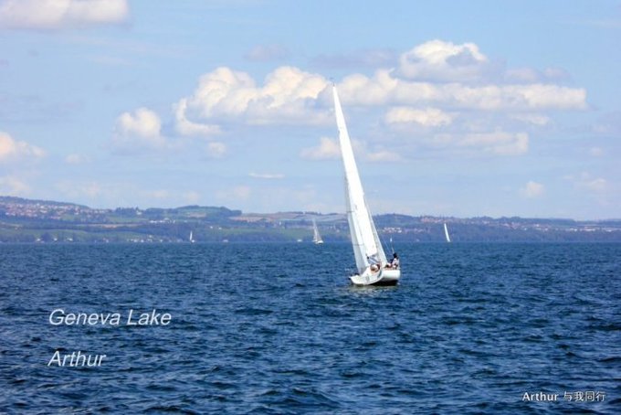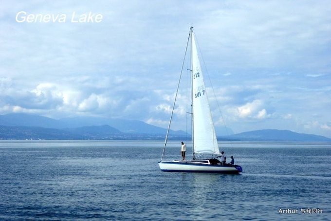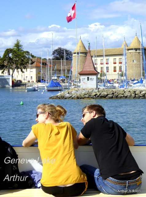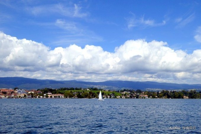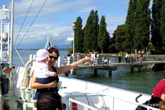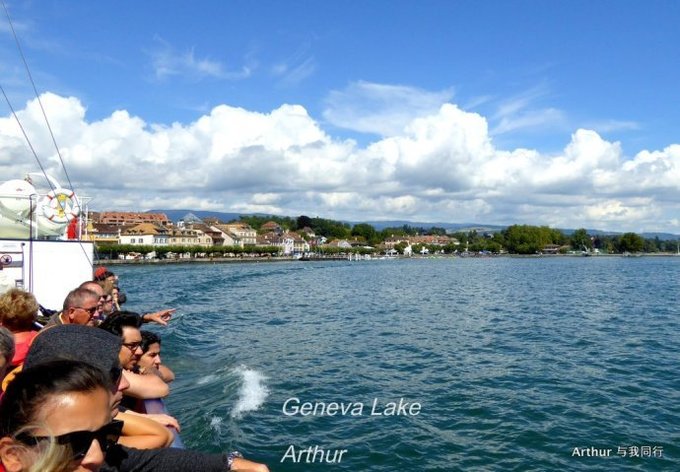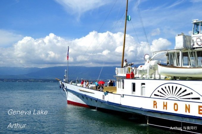 10:45分我们乘坐的船只随着一生汽笛的鸣响,稳稳的驶出了洛桑船港。我们的目的地是日内瓦湖另一侧的伊瓦尔小镇(Yvoire),不过现在还不能急,因为船儿要在湖上飘荡两个半小时。日内瓦湖好大,而散落在湖边的尽是些美丽的小镇,而我们选择的是那种交通船,也就是像火车一样一站站的停靠,然后下人,上人,再开往下一个港口。船儿靠岸和驶离会耽误不少功夫,但是我们也就可以一个个美色小镇看过来,这样对我们这种不赶时间的游客来说就太对口味了。 上船后在船头处找了一个好位子,稳稳的坐着,沐浴着阳光,呼吸着纯净的空气,开始了一场美丽的视觉之旅。大湖的东面也就是我们刚来的地方飘荡着大块的云朵,看样子那里又开始下雨了,但是我们头顶上的天空却是一片湛蓝,庆幸今天出山的决定。仰头看天,以前不太理解何为云卷云舒,而现在飘荡在大湖上,看着广辽的天空上云朵翻涌,有点明白这个词的意思了!