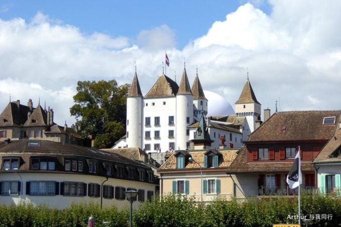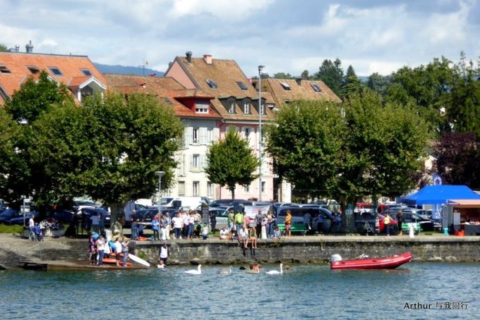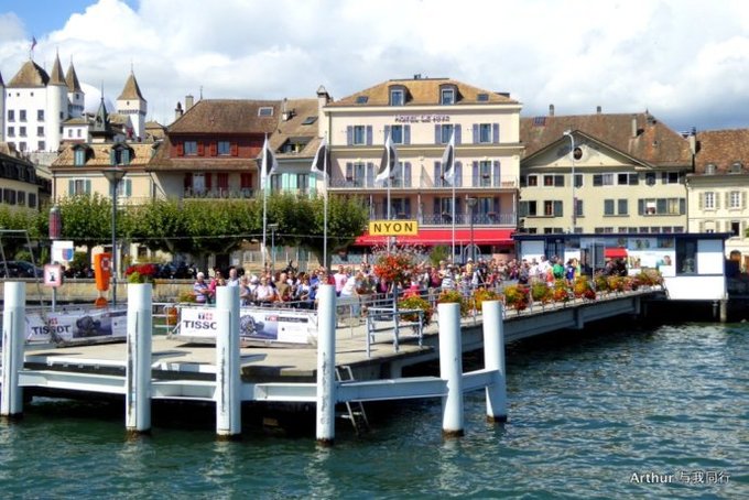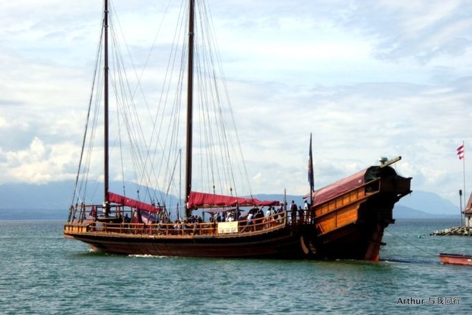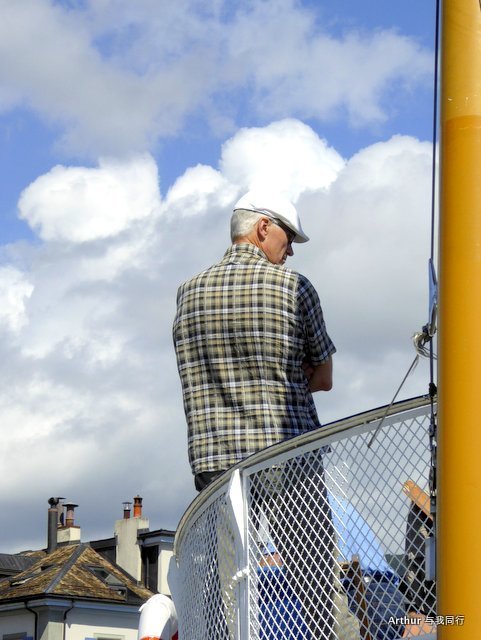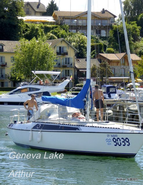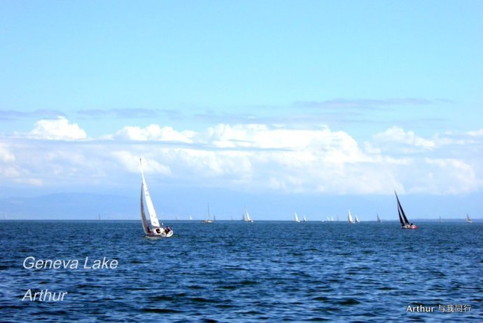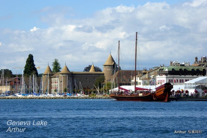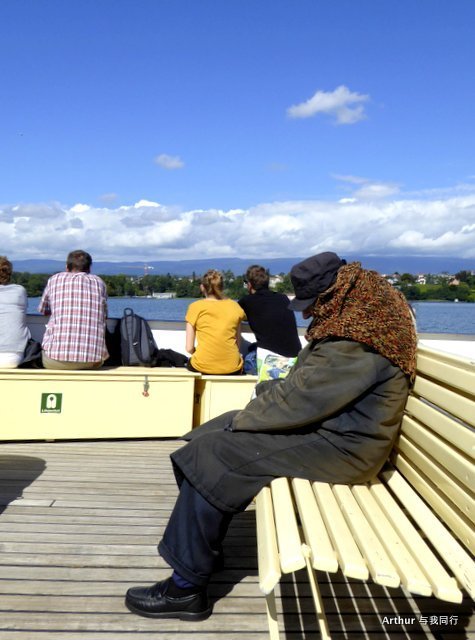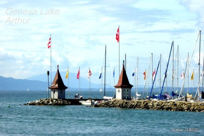10:45分我们乘坐的船只随着一生汽笛的鸣响,稳稳的驶出了洛桑船港。我们的目的地是日内瓦湖另一侧的伊瓦尔小镇(Yvoire),不过现在还不能急,因为船儿要在湖上飘荡两个半小时。日内瓦湖好大,而散落在湖边的尽是些美丽的小镇,而我们选择的是那种交通船,也就是像火车一样一站站的停靠,然后下人,上人,再开往下一个港口。船儿靠岸和驶离会耽误不少功夫,但是我们也就可以一个个美色小镇看过来,这样对我们这种不赶时间的游客来说就太对口味了。 上船后在船头处找了一个好位子,稳稳的坐着,沐浴着阳光,呼吸着纯净的空气,开始了一场美丽的视觉之旅。大湖的东面也就是我们刚来的地方飘荡着大块的云朵,看样子那里又开始下雨了,但是我们头顶上的天空却是一片湛蓝,庆幸今天出山的决定。仰头看天,以前不太理解何为云卷云舒,而现在飘荡在大湖上,看着广辽的天空上云朵翻涌,有点明白这个词的意思了!