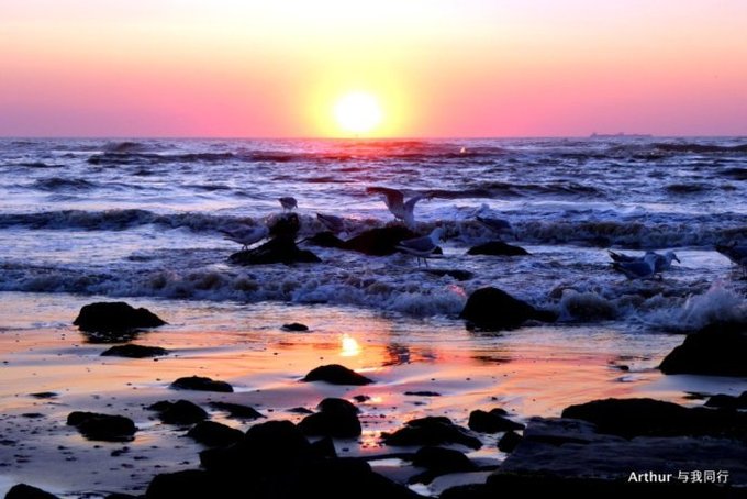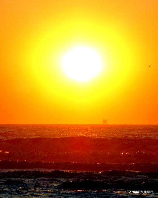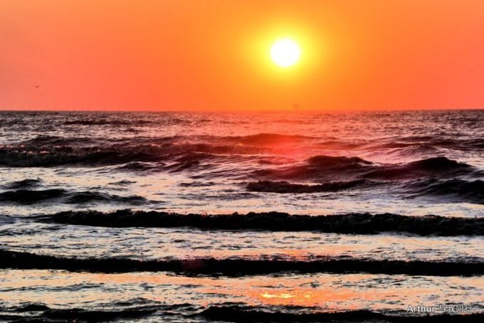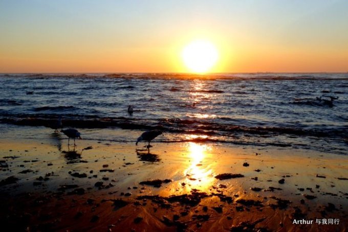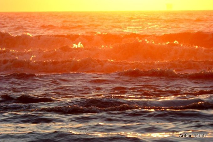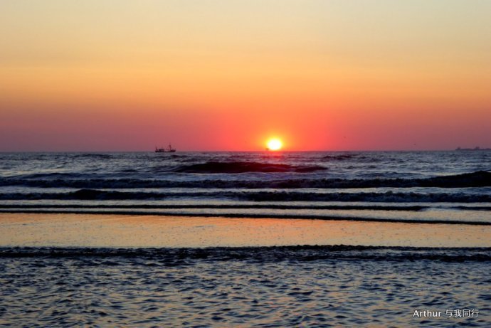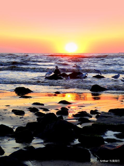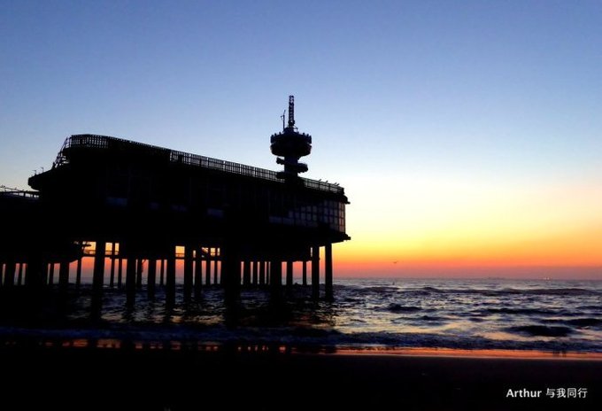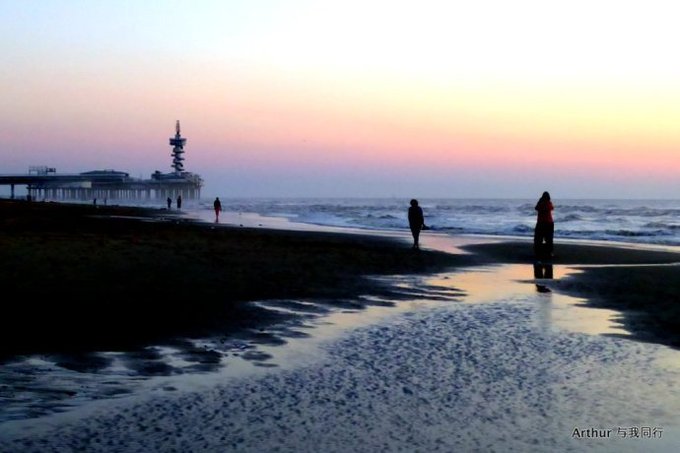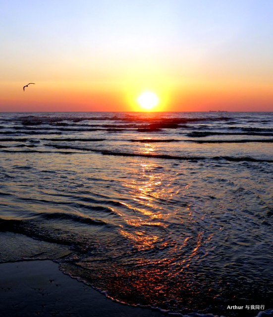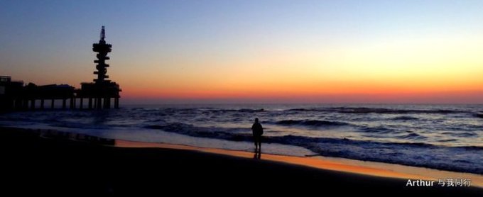 在海牙的北海边,运气好的话你会看到一场绚烂无比的日落景象。 天空从湛蓝慢慢转化为橙黄,慢慢过渡到粉红,最后是金黄到血色红霞,那份震撼无以言表。 站在大海边痴痴的看着太阳一点点的接近海面,海水也会由蓝白色转为深黑,最后变成闪着金光的橙红。太阳跳进大海的那一刻世界寂静无声,刹那悸动在心底震颤,万千感慨。 遥远的海面上飞过一只只翱翔的海鸥,似乎可以听到那一声声呼唤,呼唤明天新的太阳!