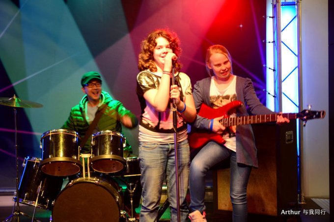 哈哈,我跟两个小姑娘临时组成了一个电子乐队,那就摇滚一下吧!