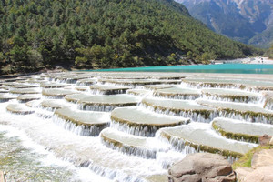 黄龙景区位于岷山主峰雪宝顶脚下,是一条由南向北,逐渐隆起的钙华体山脊,地势极像一条昂首腾跃的巨龙,歇息在雪峰冰川晶莹的怀抱中。从沟口拾级而上,巨龙的脊背蜿蜒起伏,无数滩流、瀑布湍湍而下,仿佛龙掌戏水;满山艳丽的杜鹃花、火红的枫叶、金光闪烁的毛苠,与色彩斑斓的大小彩池交相辉映,风景美不胜收。