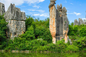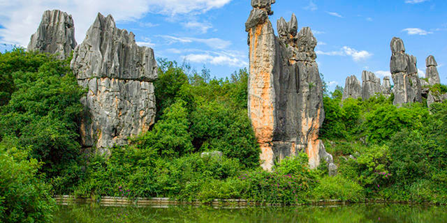 石林位于昆明市东,是世界罕见的风景名胜,是大自然鬼斧神工的杰作。在路南广达400平方公里的区域内,遍布着上百个黑色大森林一般的巨石群。有的独立成景,有的纵横交错,连成一片,占地数十亩,上百亩不等。深、幽、险、奇是石林景区的景观特征。