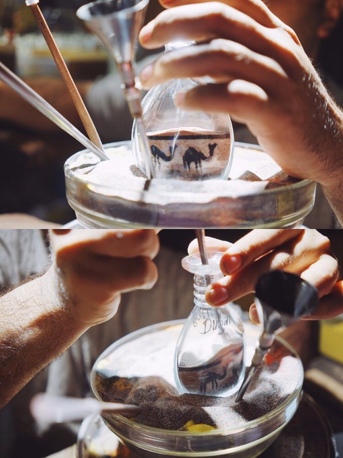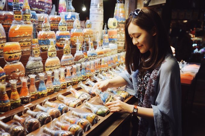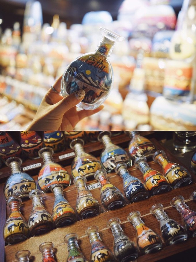 我曾经在电视上看过集市中有一家店在卖有沙漠特色的沙瓶,将不同颜色的细沙层层叠叠地塞在透明的玻璃瓶中,勾勒出一幅沙漠、骆驼与太阳的景色,小时候课本上老是提到的“丝绸之路”的光景一下子就浮现在眼前!还可以制作带有自己名字的、只属于自己的沙瓶~