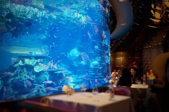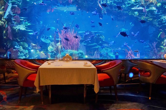 在超大的水族箱旁边,和众多鱼儿一起共进晚餐,这种人鱼公主般的享受,大概是很多小仙女小时候憧憬的事情之一吧!因为餐厅每天都爆满,所以建议要来的朋友们提前1-2天预约位置哟~