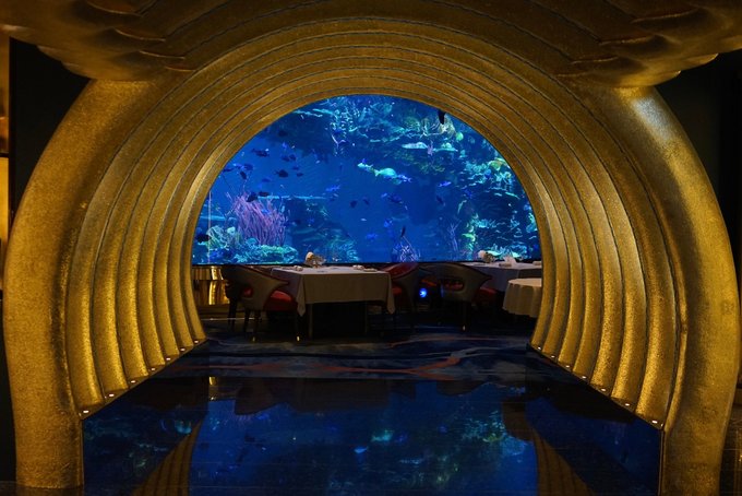 Nathan Outlaw At Al Mahara海底餐厅 位于迪拜帆船酒店的Nathan Outlaw At Al Mahara海底餐厅。装潢以蓝色和金色为主调,如果想去的话建议大家提前预定,也许会选到一个靠着鱼缸的好位置~