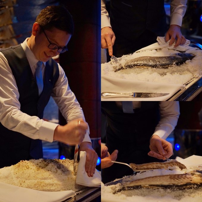 我们点了烤鱼和主菜,服务生小心翼翼的将的鱼骨和鱼肉分离出来,再端上餐桌,只此一点就可看出餐厅的服务之周到,细心~