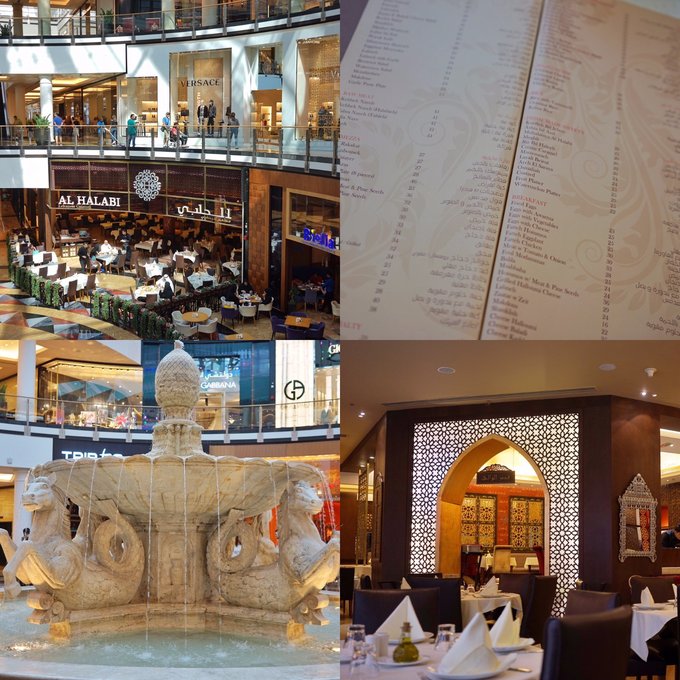 AL HALABI餐厅 位于Mall of the Emirates的AL HALABI餐厅,环境位置都是没话说~到了迪拜,吃一顿当地的美食必不可少。这家餐厅的馕和蔬菜都是无限量供应的,因为馕特别好吃,主菜还没上就已经吃饱了~我们都打趣说可以把正餐退了哈哈~!