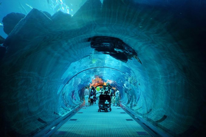 目的地体验之—— 遇见全球之最的水族馆 The Dubai Mall最特别的就是除了逛街以外还有世界最大的室内水族馆~横跨商场三层的超大水族馆真的非常壮观~不买票的话可以从沿着水族馆外围的玻璃墙观看,买票了的话就可以进入水族馆从里面观看,有那种拱形的水下通道,里面有几万只海洋生物,还可以看到南非虎头鲨和黄貂鱼从头顶游过~
