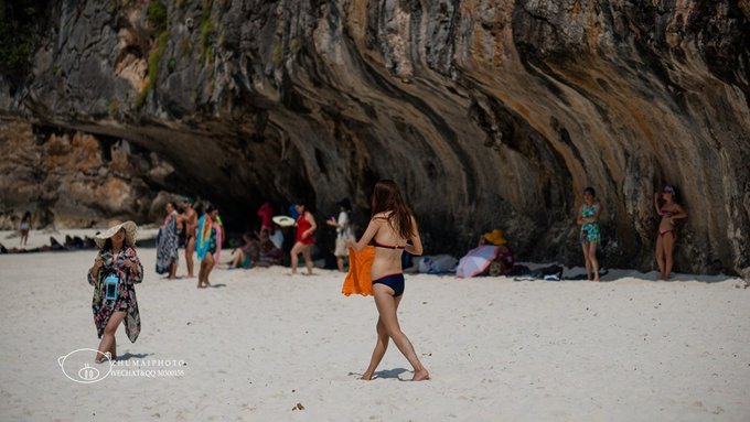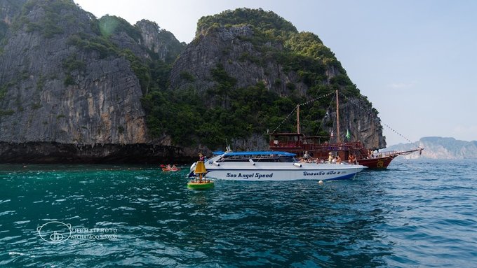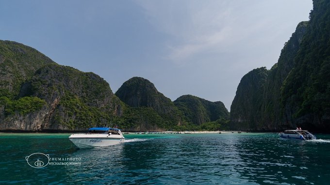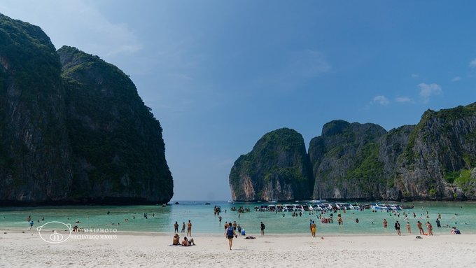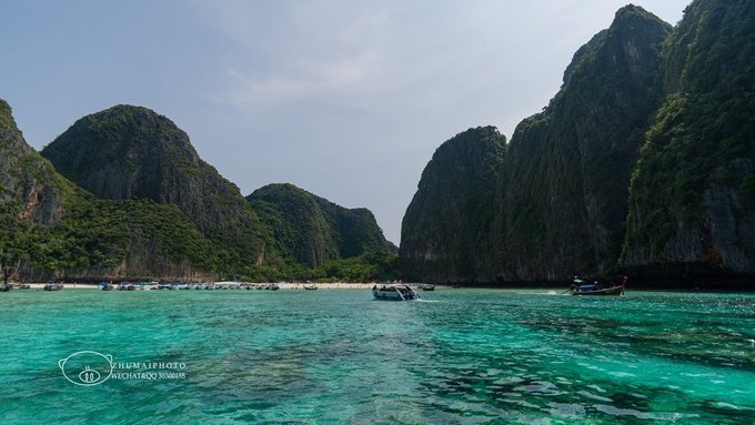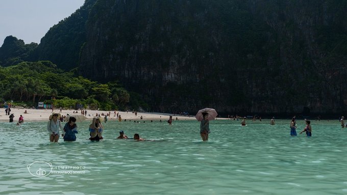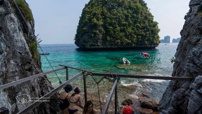 我们坐船一沿着山直往「玛雅湾」去,玛雅湾位于小PP岛的西南部,整个小PP岛礁石壁立,很少有沙滩,玛雅湾的沙滩特别令人惊喜。这个小海湾三面环绕着高达百米的绝壁,只有一个狭窄的出海口,给人一种与世隔绝的感觉。这里海水清澈,沙子洁白细腻,网上看到的小PP岛经典照片都是在这里拍摄的。
