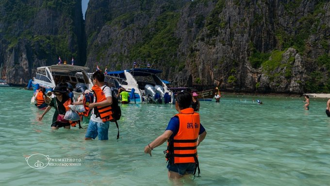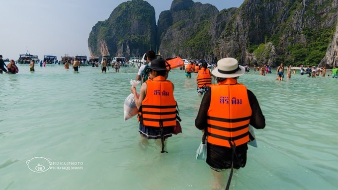 玛雅湾的沙滩混杂了一些珊瑚和贝壳,赤脚踩上去要当心被划伤。所以最好还是穿上软底拖鞋,这样会玩得尽兴又安全。