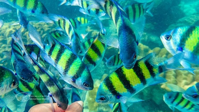 海水清澈湛蓝,海滩细沙如银,珊瑚礁生趣盎然,可潜游海底世界,在鱼群陪随下,尽情欣赏多彩多姿的珊瑚和各种海洋生物。海水透澈,把头插进水里,海底世界一揽无遗。