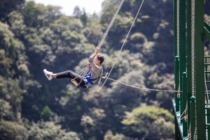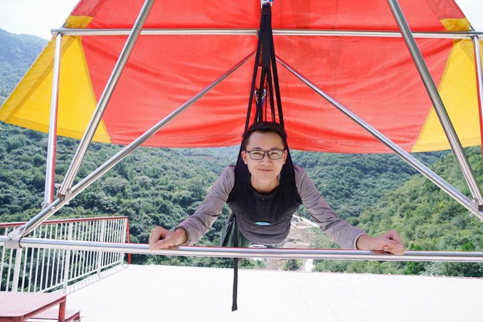 这条索道滑翔翼全长490米,全程下来差不多40多秒,相当于一秒钟10米!整个人相当于趴在吊带里面,肩膀及大腿都有安全绳固定,人在往下俯冲时明显可以感觉到被包裹着,不像悬崖秋千啥也感觉不到,没有安全感,可以单人体验,也可以双人体验。 滑翔中,可以像鸟儿展翅一样展开双臂,眼前景色瞬间被抛向脑后。这个是强烈建议体验,体验了一次本还想体验第二次,