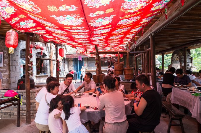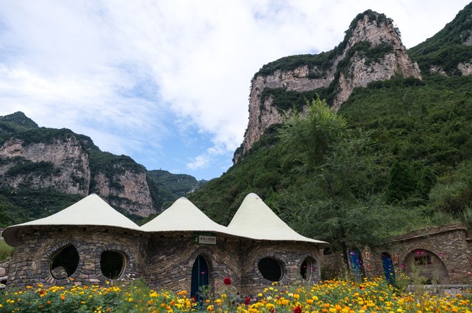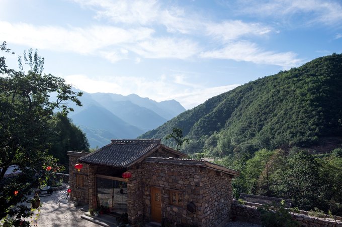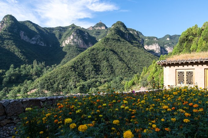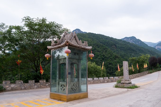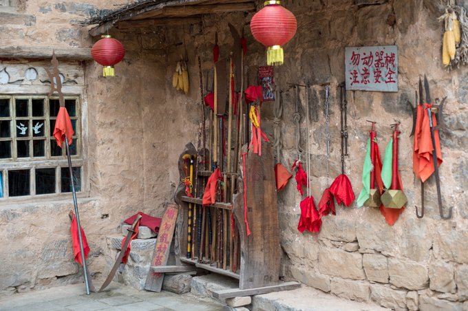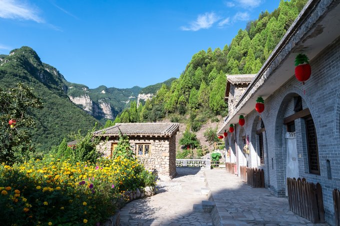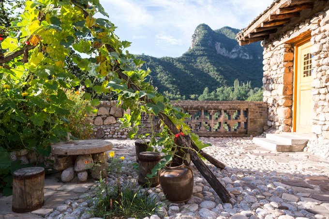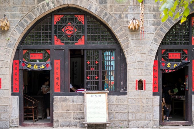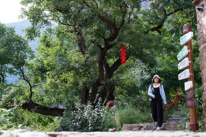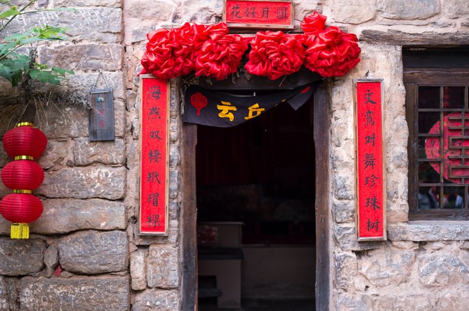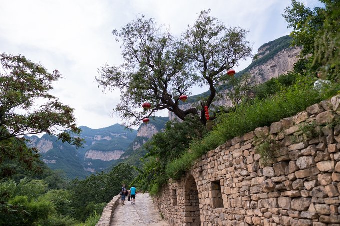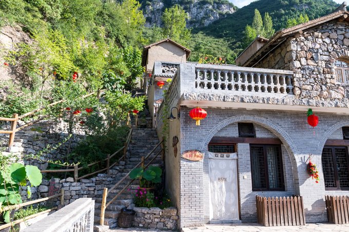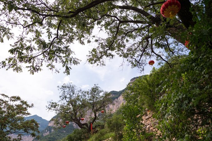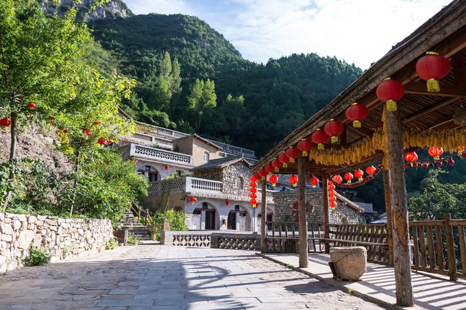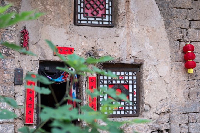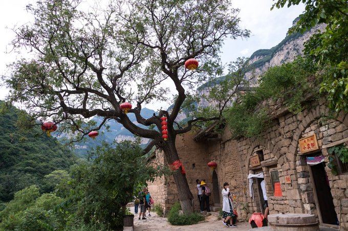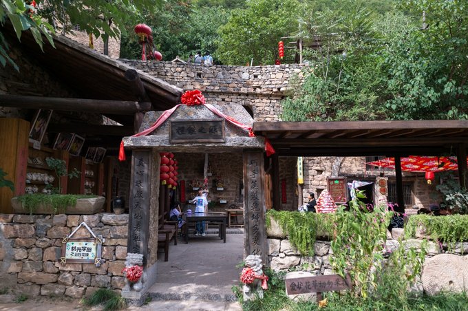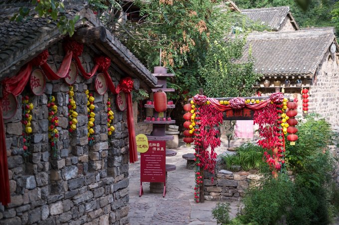 整个村落依山傍水,林木繁茂,房屋建筑取材于山上的石头,住起来冬暖夏凉。 村落中还有许多年数已久的古树,其只就有元代的皂角树、唐代的槐树、隋朝的槐树及一棵千年栾树,树上挂上了大红灯笼,红红火火。村落中的一条主干道感觉也是之前保留下来的,路两旁还有一些原先生活在这里的居民留下来的农耕工具,这些都足以见证其村落的历史悠久。