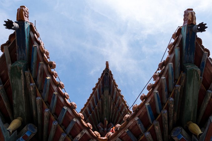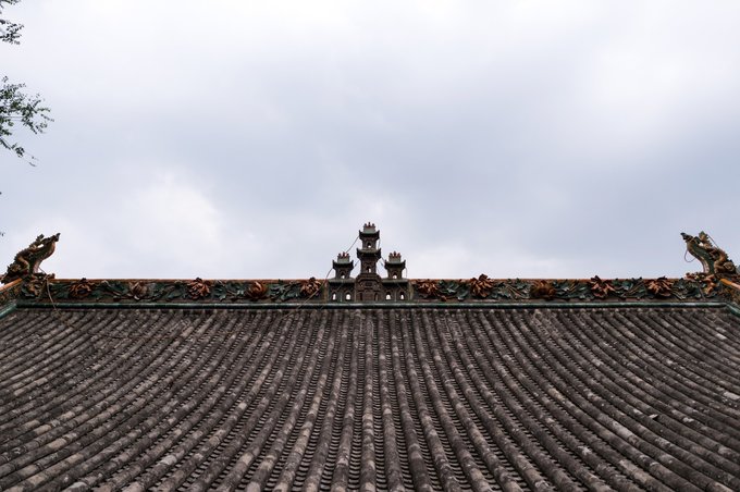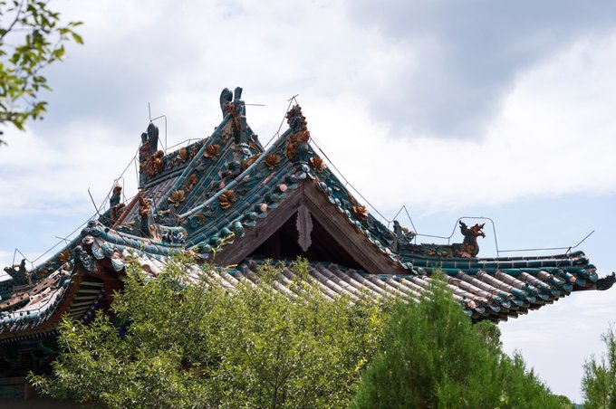 三祖殿屋顶的青龙及正中间的震殿物,并用铁链条连接,这个和一些人家里压宅所用的鼎左右差不多,主要起到镇宅的作用。