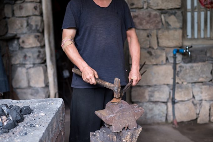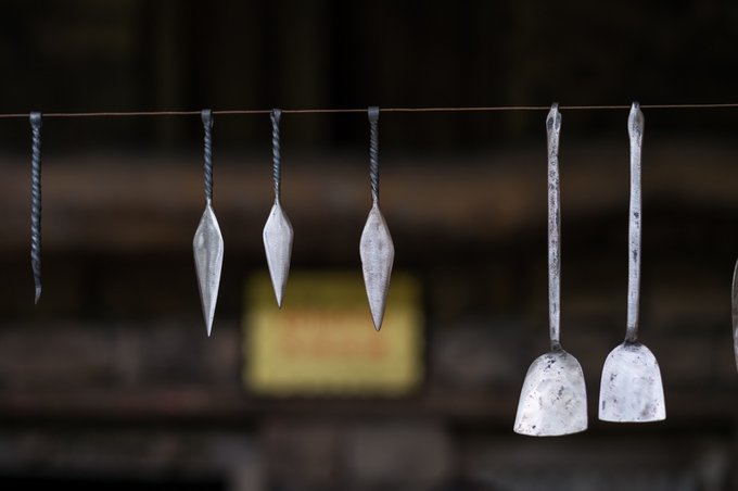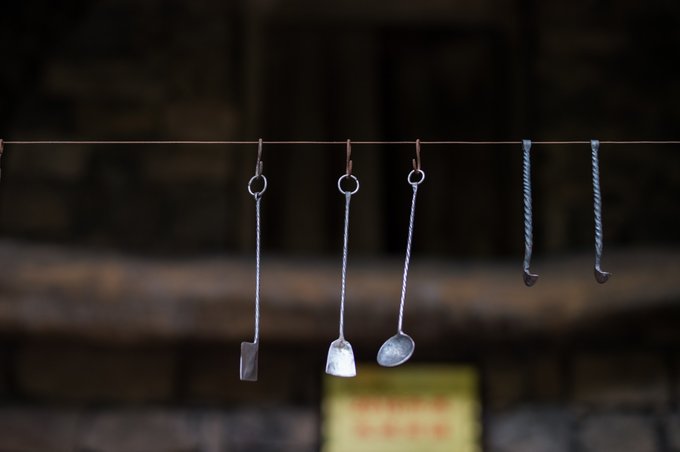 这里还有一家铁匠铺,铁匠师傅正在一锤一锤的敲打着,不管是什么形状的铁,只要拿在铁匠师傅的手上,使之变方、圆、长、扁、尖均可。在身前悬挂有一排已经做好的成品,大多是厨房用的一些器具及调羹。