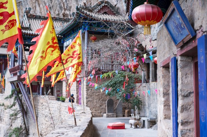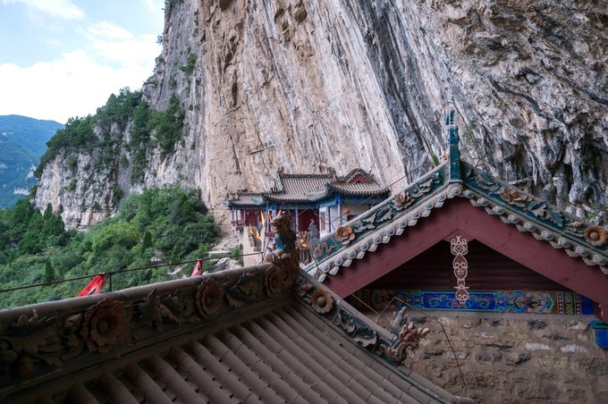 整个道观建筑东西长80米,深度峭壁20米,高度230米,整体建筑檐斗拱,凌空与绝壁之上,据悉可一次性容纳3000多人,就这样安静的隐匿于这片大山之中,用人间仙境来形容绝不为过!