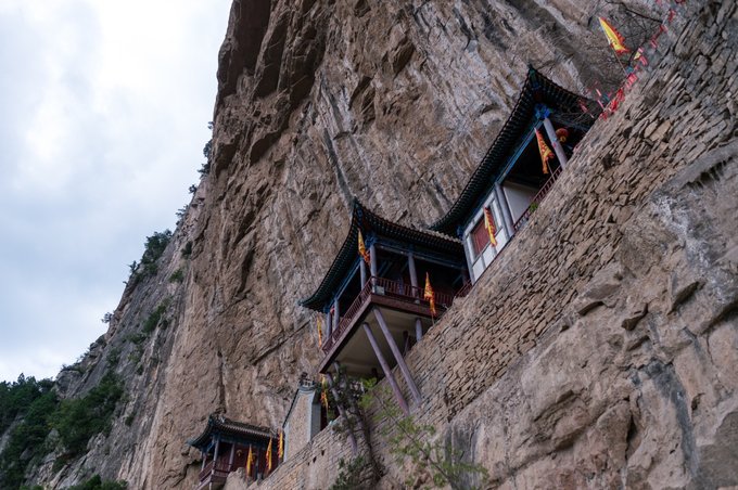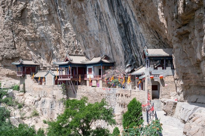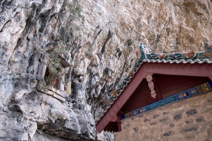 这座悬空建筑位于山西云丘山,据乡宁县志记载,原来这里叫“肝花洞”,在元朝时期,长春真人丘处机云游到此地,发现风水极佳,是一块不可多得的宝地,于是决定在此修行,因此这里也成为了全真教龙门派的发祥地,名字也由肝花洞改为玉莲洞。